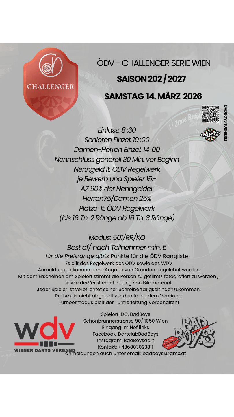 Der DC Bad Boys veranstaltet am 14. März 2026 ein ÖDV - Ranglistenturnier der Challenger-Kategorie. Gespielt werden Einzelbwerbe der Damen, Herren und Senioren. Nähere Informationen entnehmt bitte dem beigefügten Plakat.