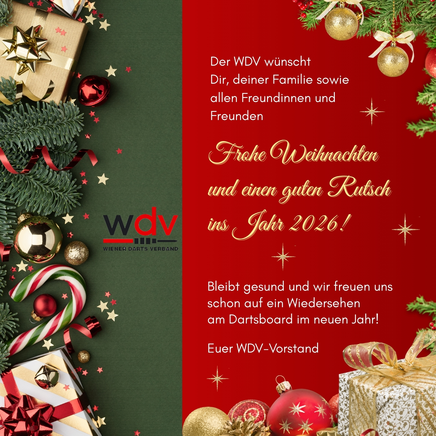 Der WDV wünscht Dir, Deiner Familie sowie allen Freundinnen und Freunden ein besinnliches Weihnachtsfest und einen gesunden, kraftvollen Rutsch ins neue Jahr! Genießt die freien Tage, ladet die Akkus auf und feiert im Kreise Eurer Liebsten. Wir blicken auf ein tolles Jahr zurück und können es kaum erwarten, im Jahr 2026 wieder gemeinsam mit Euch am Oche zu stehen. Bleibt gesund und „Good Darts“ für alles, was kommt! Euer WDV-Vorstand