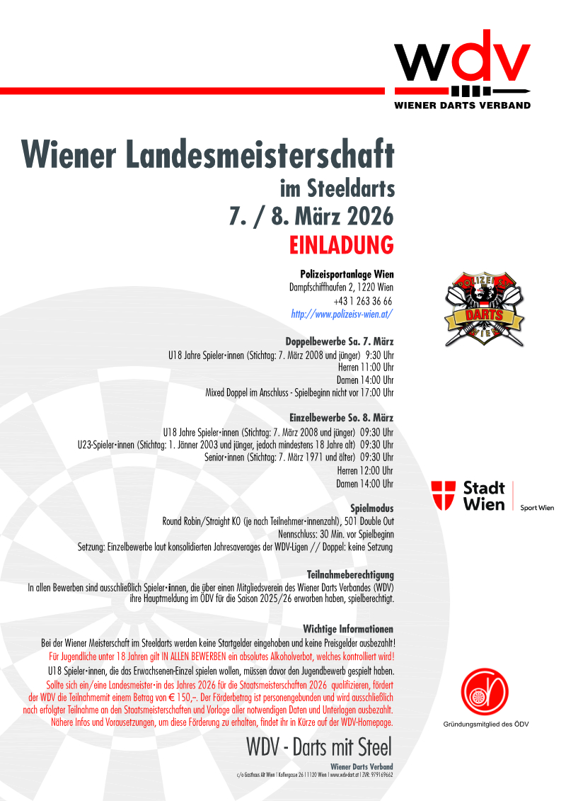Wie es bereits Tradition ist, finden Anfang März die offiziellen Wiener Landesmeisterschaften im Steeldarts statt. Stattfinden werden sie heuer erstmals auf der Polizeisportanlage am Dampfschiffhaufen 2, 1220 Wien und wir freuen uns sehr, dass wir dort zu Gast sein dürfen. Am Samstag den 7. März finden die Doppelbewerbe (Damen, Herren, Jugend und Mixed) statt, am Sonntag den 8. März die Einzelbewerbe (Damen, Herren, U18, U23 und Ü55). In den Einzelbewerben wird wird die Setzung anhand der konsolidierten Jahresaverages der WDV-Ligen durchgeführt, in den Doppelbewerben wird traditionsgemäß keine Setzung vorgenommen. IN ALLEN BEWERBEN sind ausschließlich Spieler·innen, die über einen Mitgliedsverein des Wiener Darts Verbandes (WDV) ihre Hauptmeldung im ÖDV für die Saison 2025/26 erworben haben, spielberechtigt [Anm.: ob das in Form einer Meldung in einer der beiden WDV-Ligen oder in Form einer WDV-Versicherungskarte erfolgt ist, ist unerheblich]. Und auch heuer wird der WDV die Landesmeister·innen des Jahres 2026, welche sich für die Österreichischen Staatsmeisterschaften 2026 qualifizieren, finanziell unterstützen. Nähere Infos dazu, bzgl. Teilnahmeberechtigung, Beginnzeiten usw. entnehmt bitte dem beigefügten Plakat. Achtung: Für Jugendliche unter 18 Jahren gilt IN ALLEN BEWERBEN ein absolutes Alkoholverbot, welches kontrolliert wird! Näheres zur Anreise zur Sportanlage findet ihr im Beitrag. Wir freuen uns auf möglichst viele Teilnehmer·innen. Euer WDV-Vorstand.