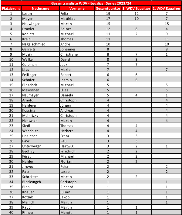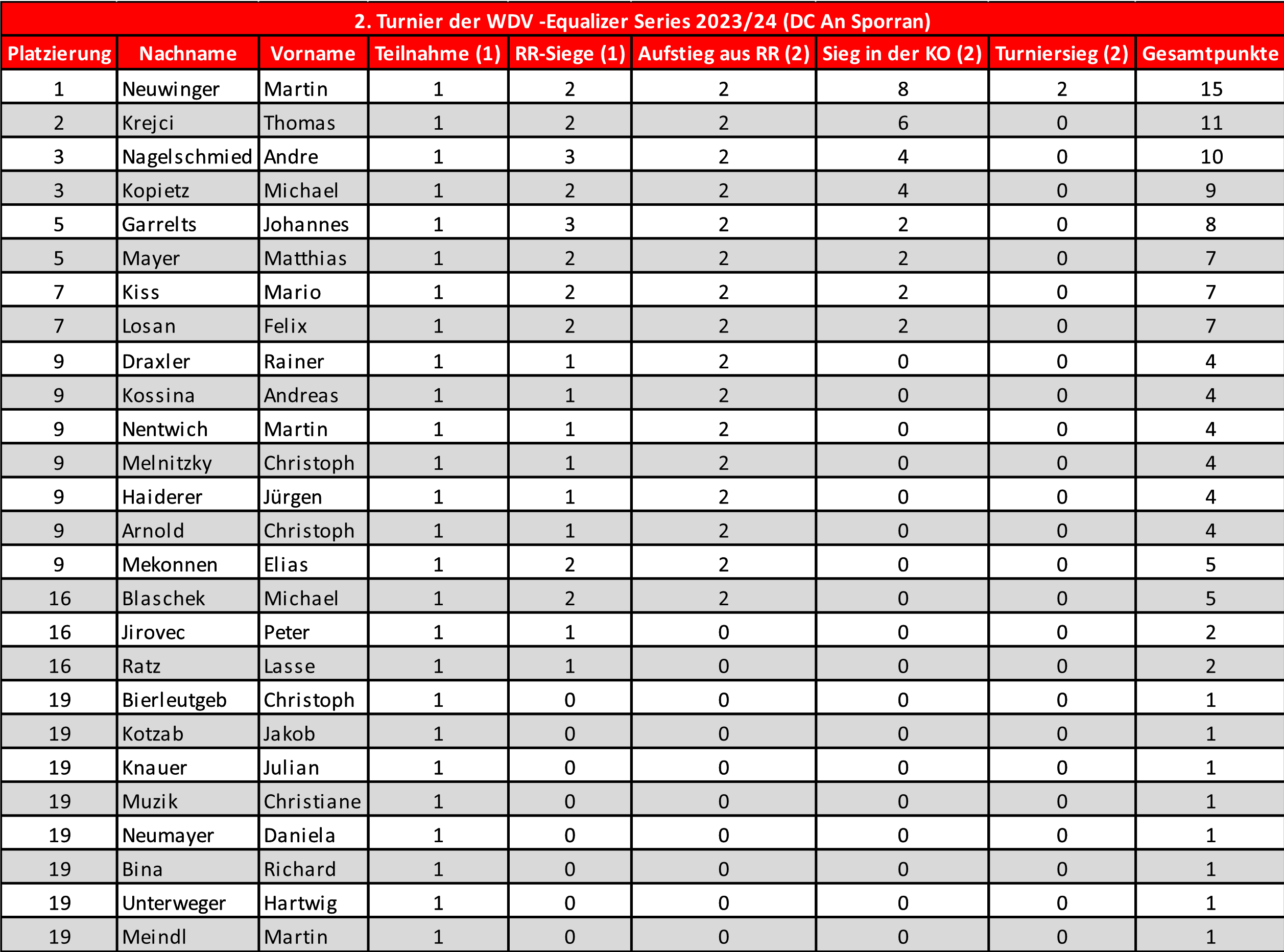 Ergenisse des zweiten Turniers der WDV - Equalizer Series und Gesamtrangliste