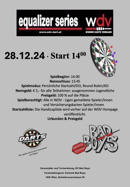 Wir freuen uns, dass der DC Bad Boys die Initiative ergriffen hat und das erste Turnier der heurigen WDV - Equalizer Series veranstaltet. Es findet im Oben & Unten, Schönbrunnerstraße 90, 1050 Wien statt. Weitere Informationen könnt ihr dem beigefügten Plakat entnehmen. Wir wünschen allen Teilnehmern und Teilnehmerinnen alles Gute und Good Darts! Edit: Die Startzahlen können bereits hier herungergeladen werden.